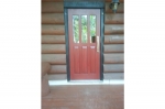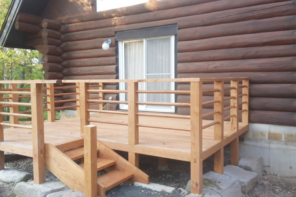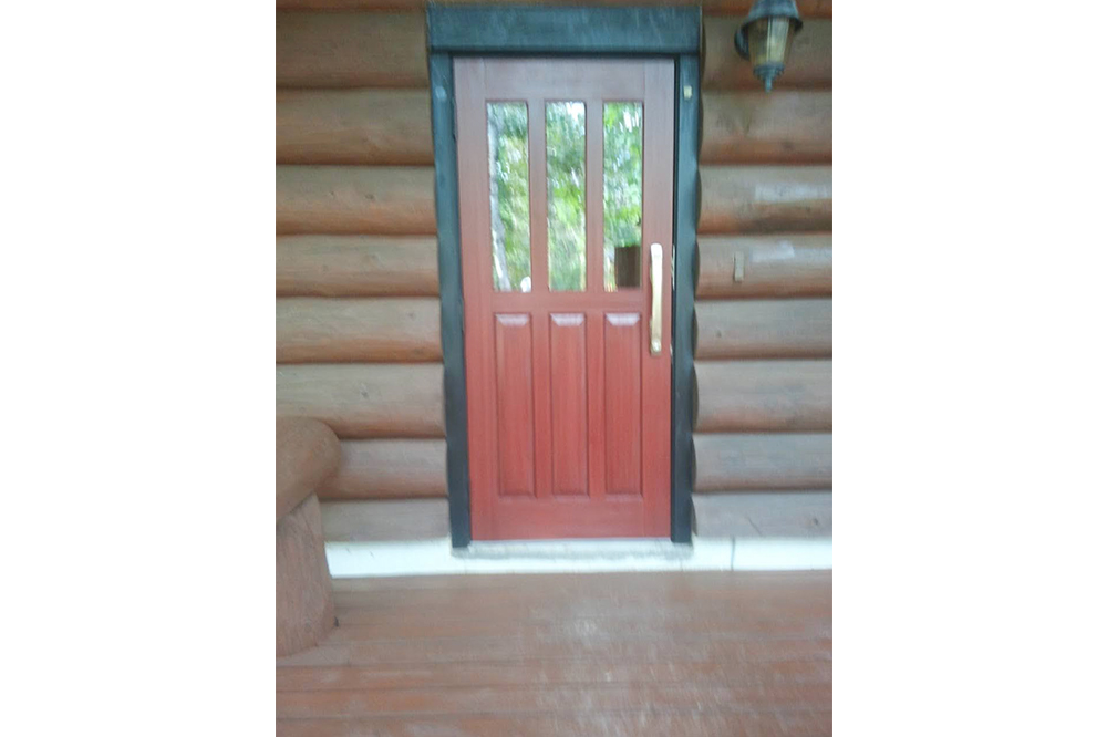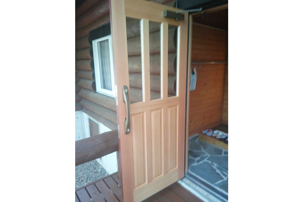 ①after中古ログハウスを安比高原に購入したのを機に玄関ドアを新しく木で作りたいと依頼され、取引している建具屋さんに作ってもらいました。形、塗料色、ドアノブ等メールでの打ち合わせを重ねました。ログハウスに詳しいということで紹介されました。
