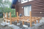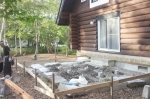 ④工事中金物を使わない伝統工法で加工した柱、土台を組み大引きに根太を入れたところです。切り石を柱が乗るところだけ平に加工しました。