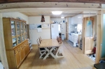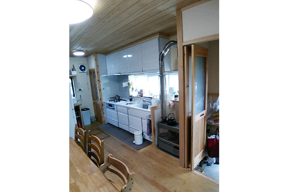 ⑨after取り替えたシステムキッチンの奥には収納を設けました。天井板は無垢の杉板貼りです。