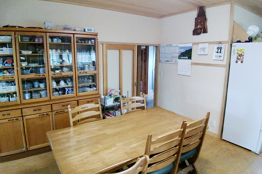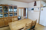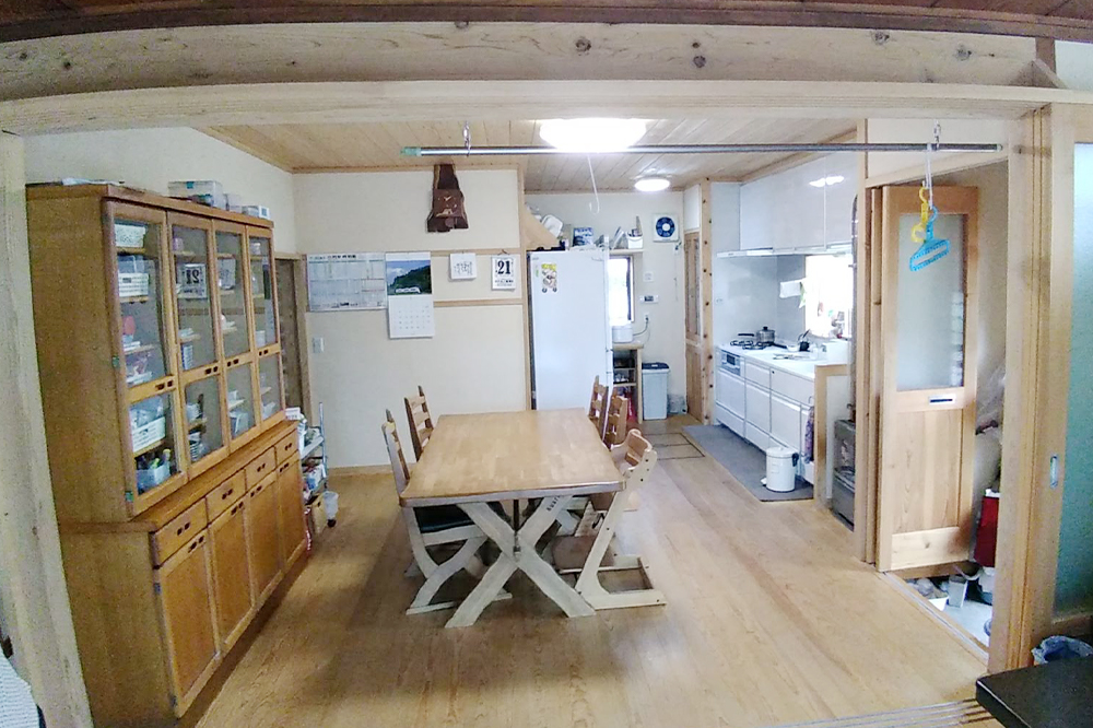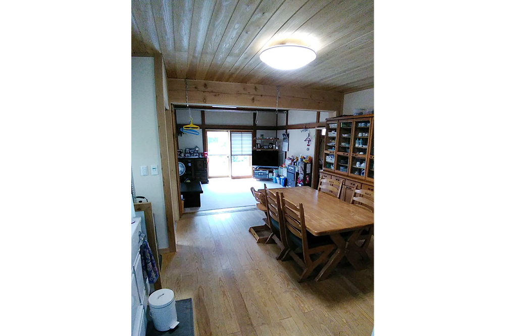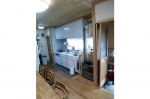 ⑦after南側の畳居間と台所を、引き戸で仕切る続き間にしました。床材は久慈市からの無垢の赤松です。
