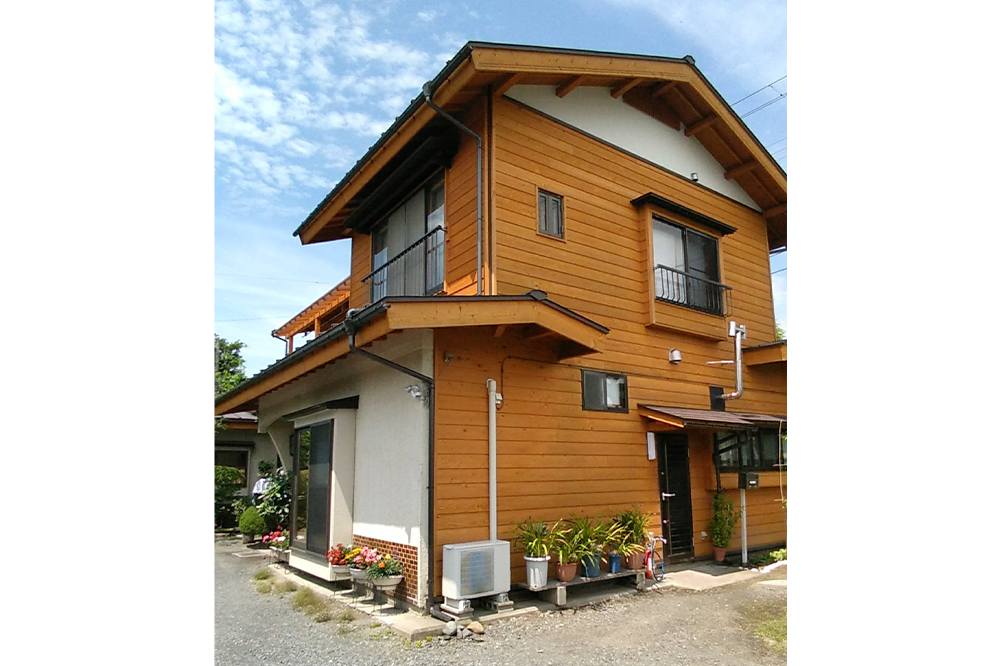 ④after道路側からの外観ですが全面的に変わりました。杉板を貼り、塗装しました。屋根勾配は急にし、破風板も幅広くしまた。