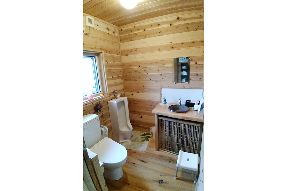 ⑮afterトイレの天井、壁にも杉板を貼りました。手洗い天板には杉の厚板を防水塗装して使用しました。