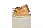 - ログハウスを意識した外観。折れ屋根、全外壁は杉の下見板です。