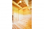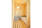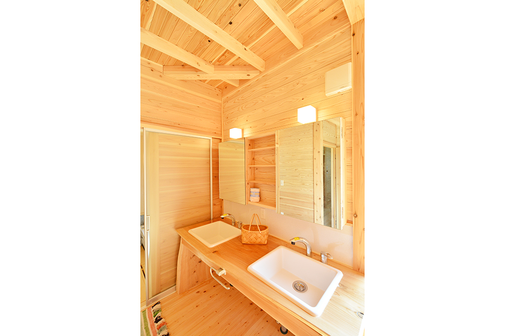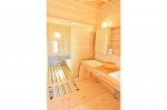 - 浴室は一般的なユニットバスではなく造作しました。床はヒバのすのこ、腰壁には御影石を貼り、その他の壁、天井はヒバ板で仕上げました。
