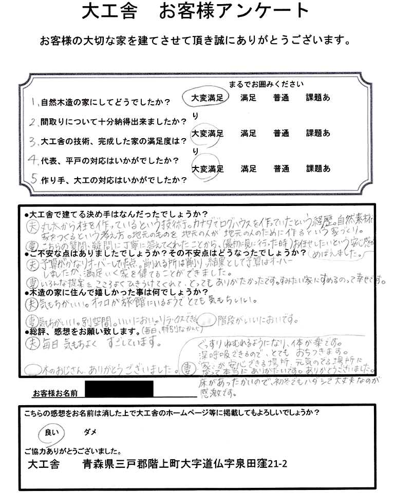 - 大工舎の技術、完成した家の満足度は?大変満足